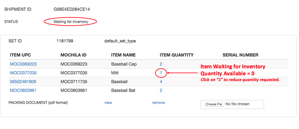 In the attached example, the Mitt has quantity requested of 1 but quantity available of 0. In order to release the shipment from Waiting for Inventory status, the quantity must be reduced to 0.